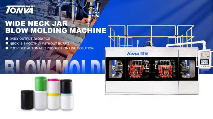 TONVA 4 cavity plastic PE jars hybrid blow molding machine, fully automated production, reduces manual intervention, significantly cuts costs, with a daily output of up to 20,000 units! This machine adopts the patented electric servo control for mold movement by echnology of TONVA, which greatly improves the accuracy and mold-changing speed. The finished product has a smooth mouth without burrs, a glossy and beautiful surface, and precise neck threads. Connect with back end process: conveyor belts, bottle leak detectors, and packaging machines can be used for batch production of various specifications of plastic jars and wide neck bottles!
